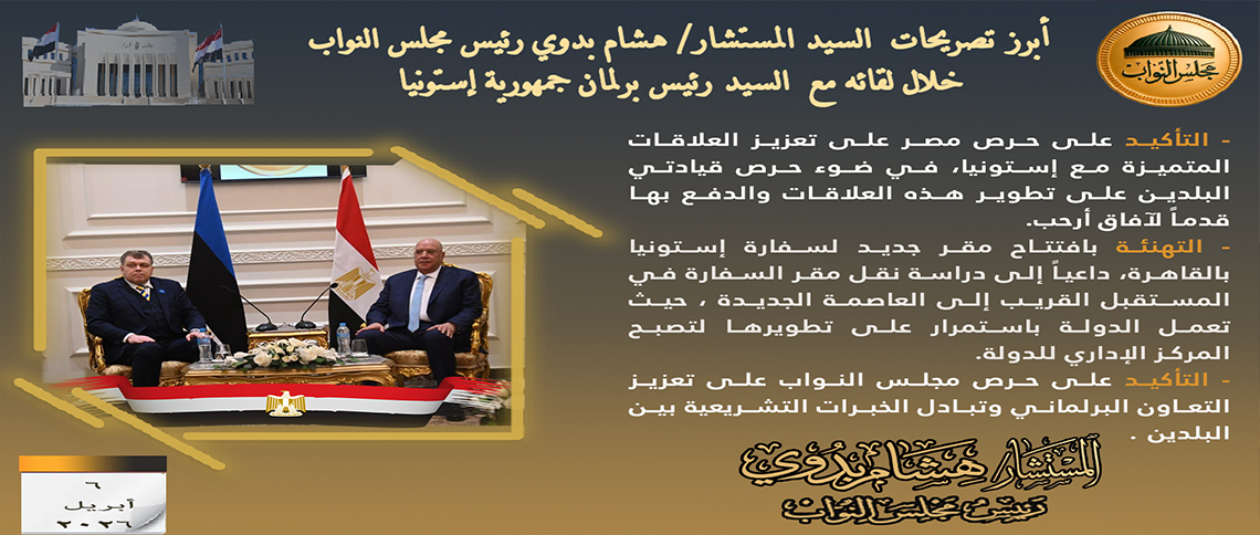 السيد المستشار أحمد مناع الأمين يحضر استقبال السيد المستشار/ هشام بدوي رئيس مجلس النواب السيد/ لوري هوسار رئيس برلمان جمهورية إستونيا في مقر مجلس النواب بالعاصمة الجديدة.