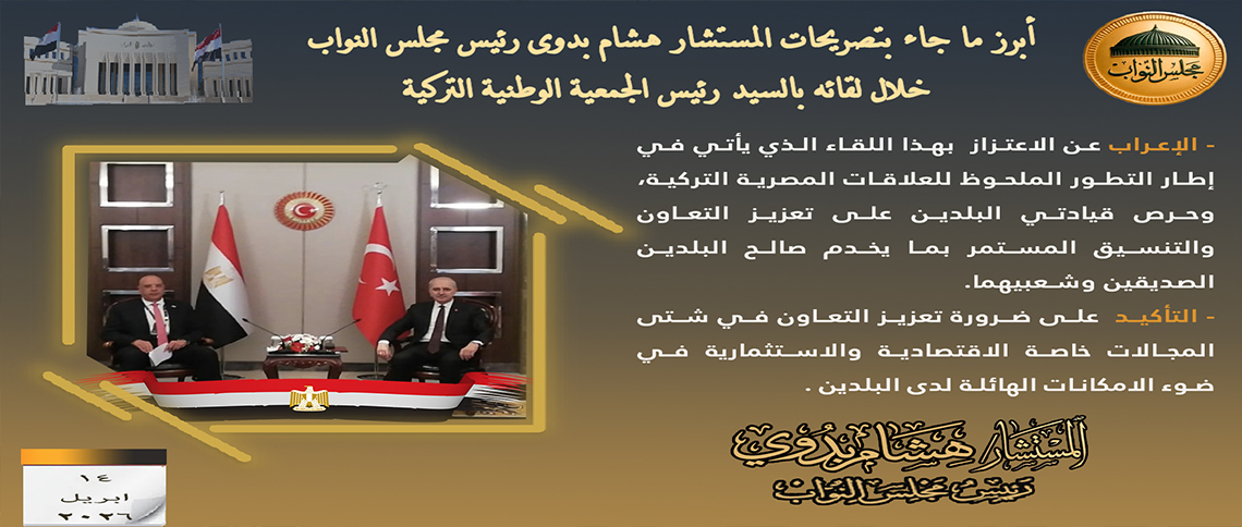 أرسل السيد المستشار هشام بدوي رئيس مجلس النواب برقية تهنئة إلى فخامة السيد الرئيس عبد الفتاح السيسي رئيس الجمهورية ؛ بمناسبة عيد الفطر المبارك وفيما يلي نص البرقية : فخامة السيد الرئيس/ عبد .....